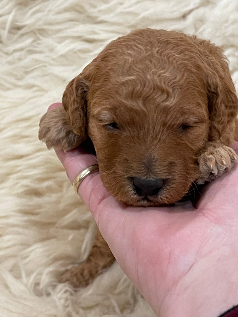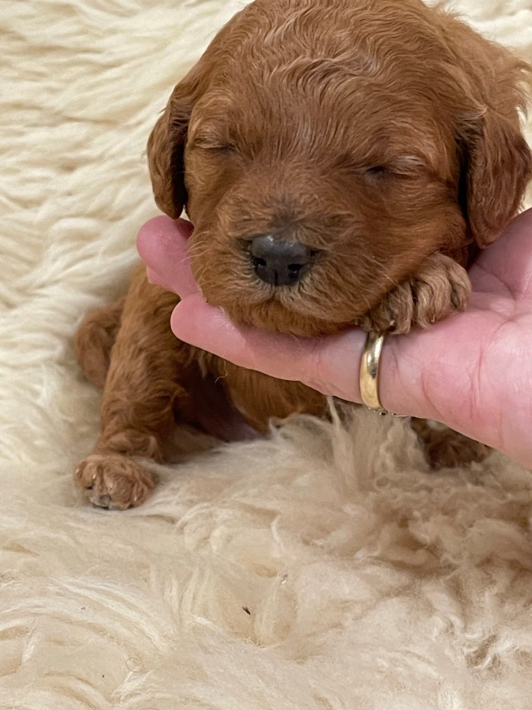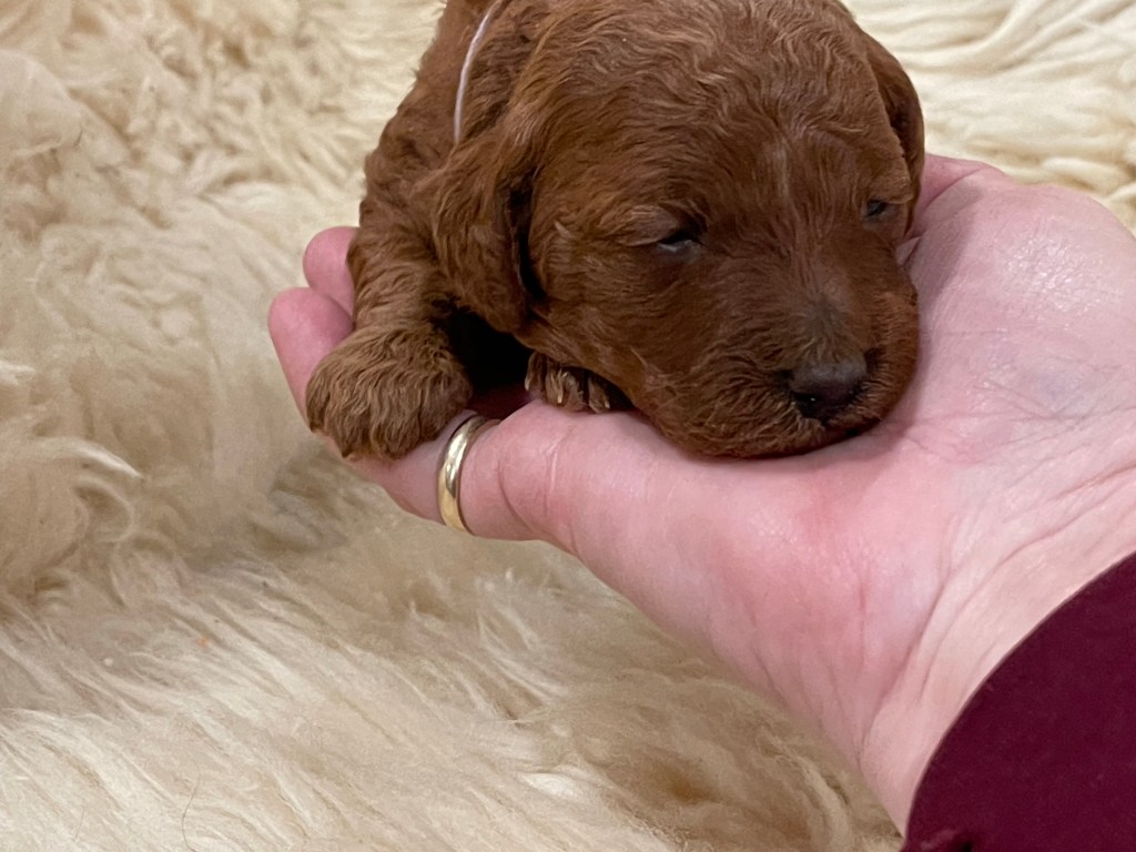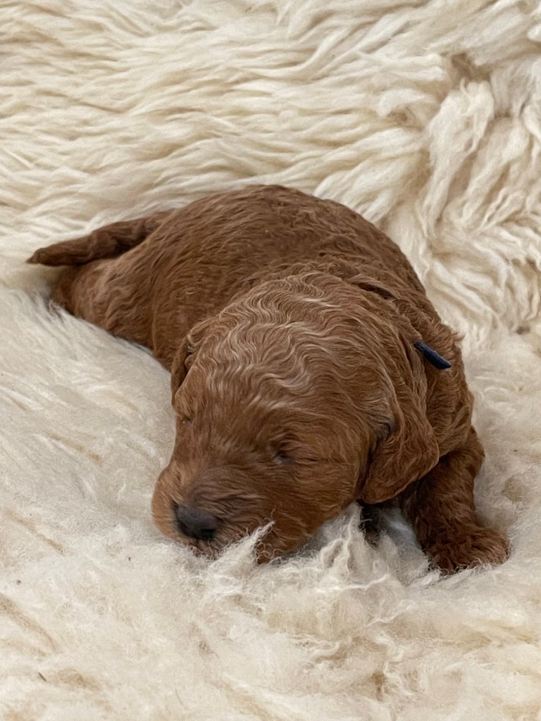 Precious little babies! The puppies are varying shades of beautiful red, but I’m afraid my camera didn’t catch the light very well. Puppies seem a bit more orangey in the photos, so enjoy their sweet sleepy newborn pictures here, and I will try to put up some shots that better capture their true red coloring.