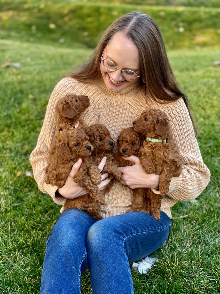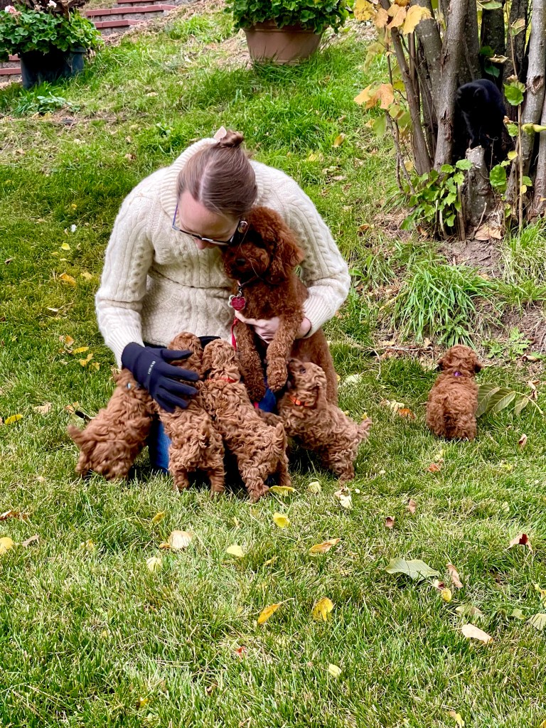 (All now adopted) Red AKC Miniature poodle puppies this fall! Hazel, Essie, and Maggie all had their puppies the same week in September. It’s Puppyland around here!