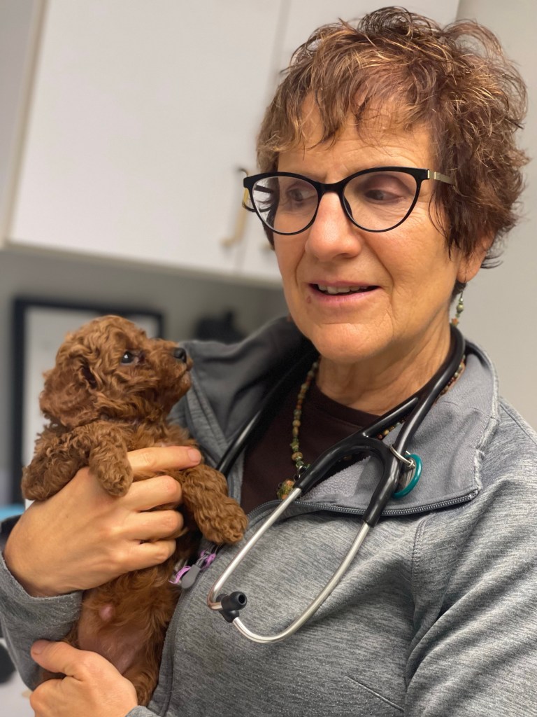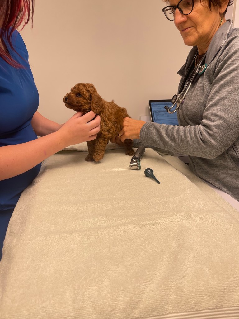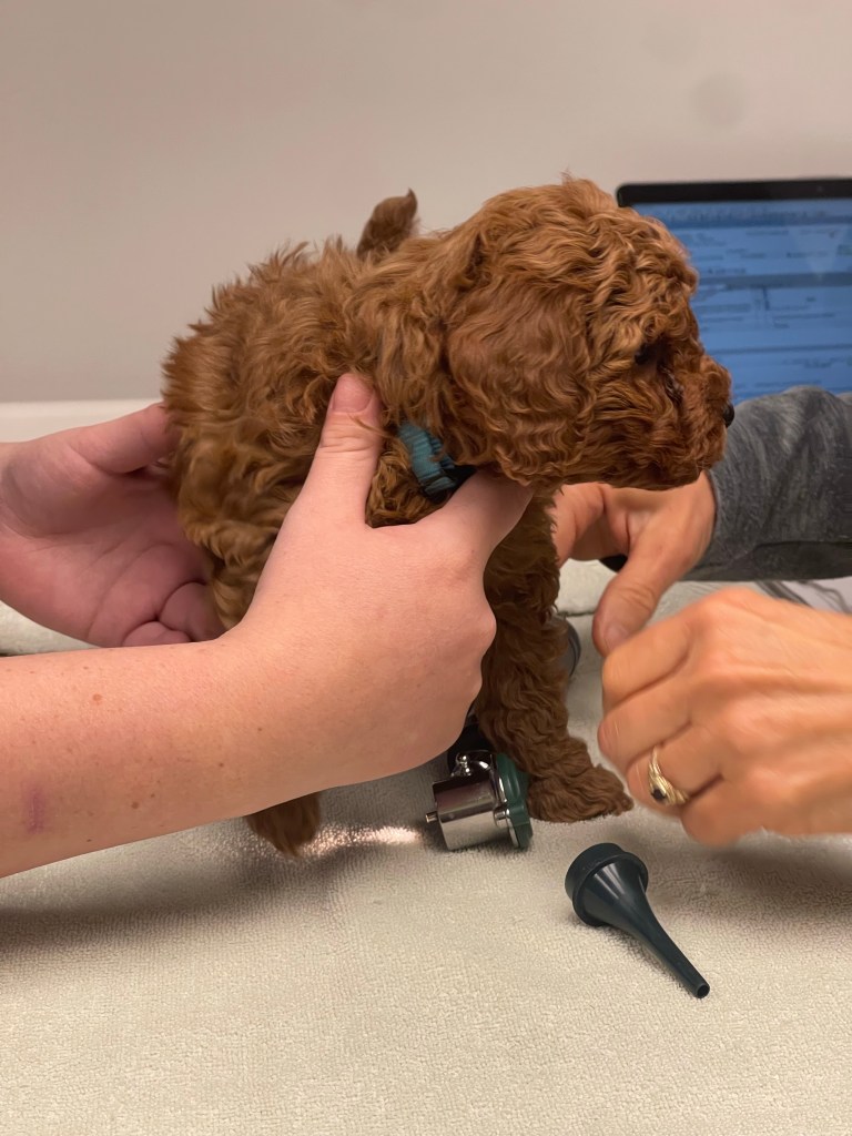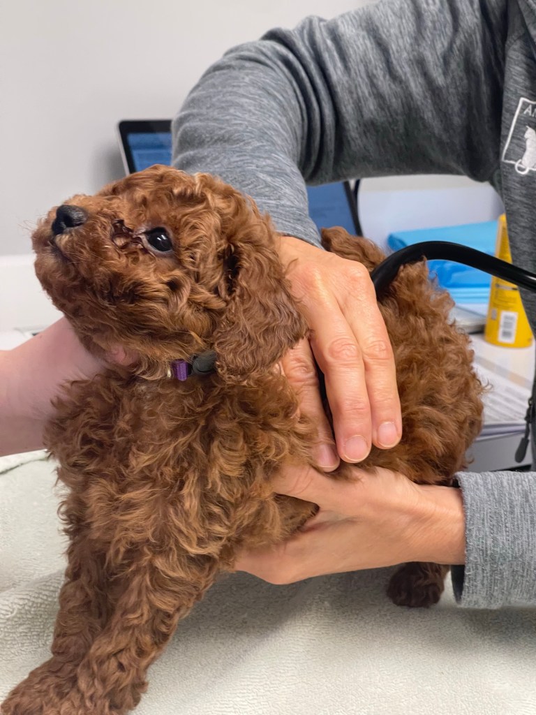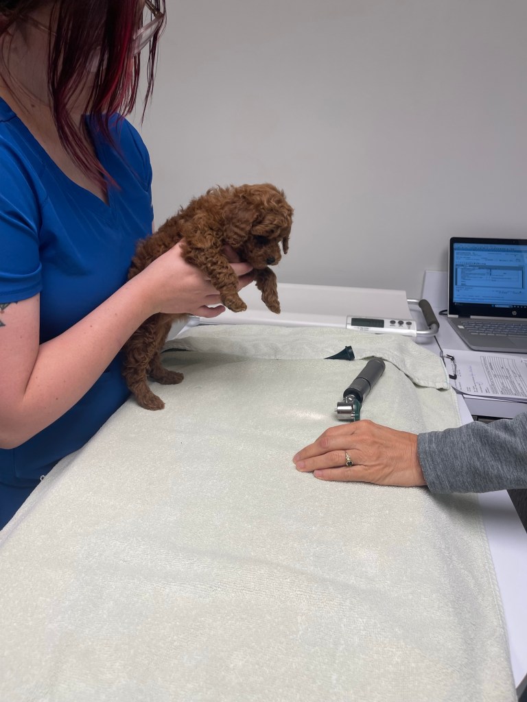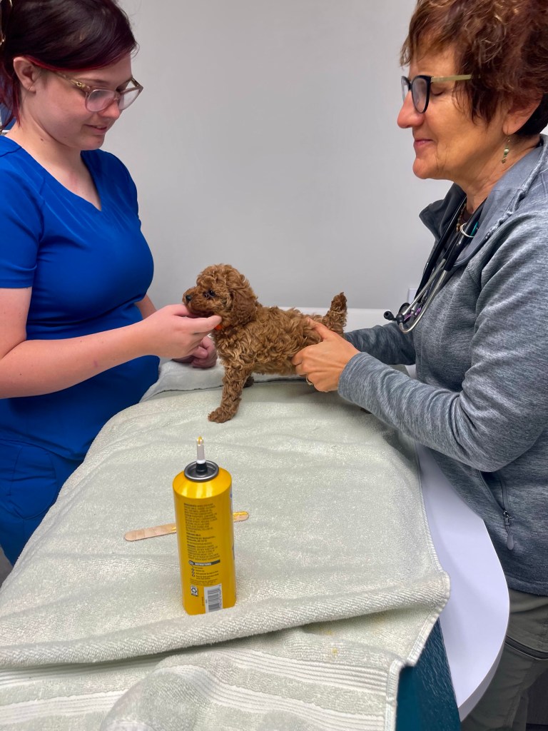 Hazel’s puppies were stars at their checkup! No fussing! The cutest! Easy cheese is a tasty puppy distraction…worked like magic today.