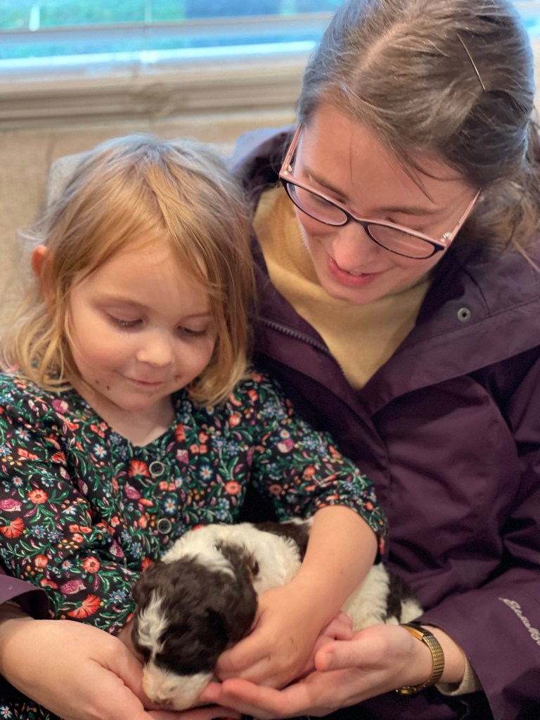 Puppies remain with their mother and littermates in our home until 8 weeks of age. They then will be ready to be adopted into their forever families.