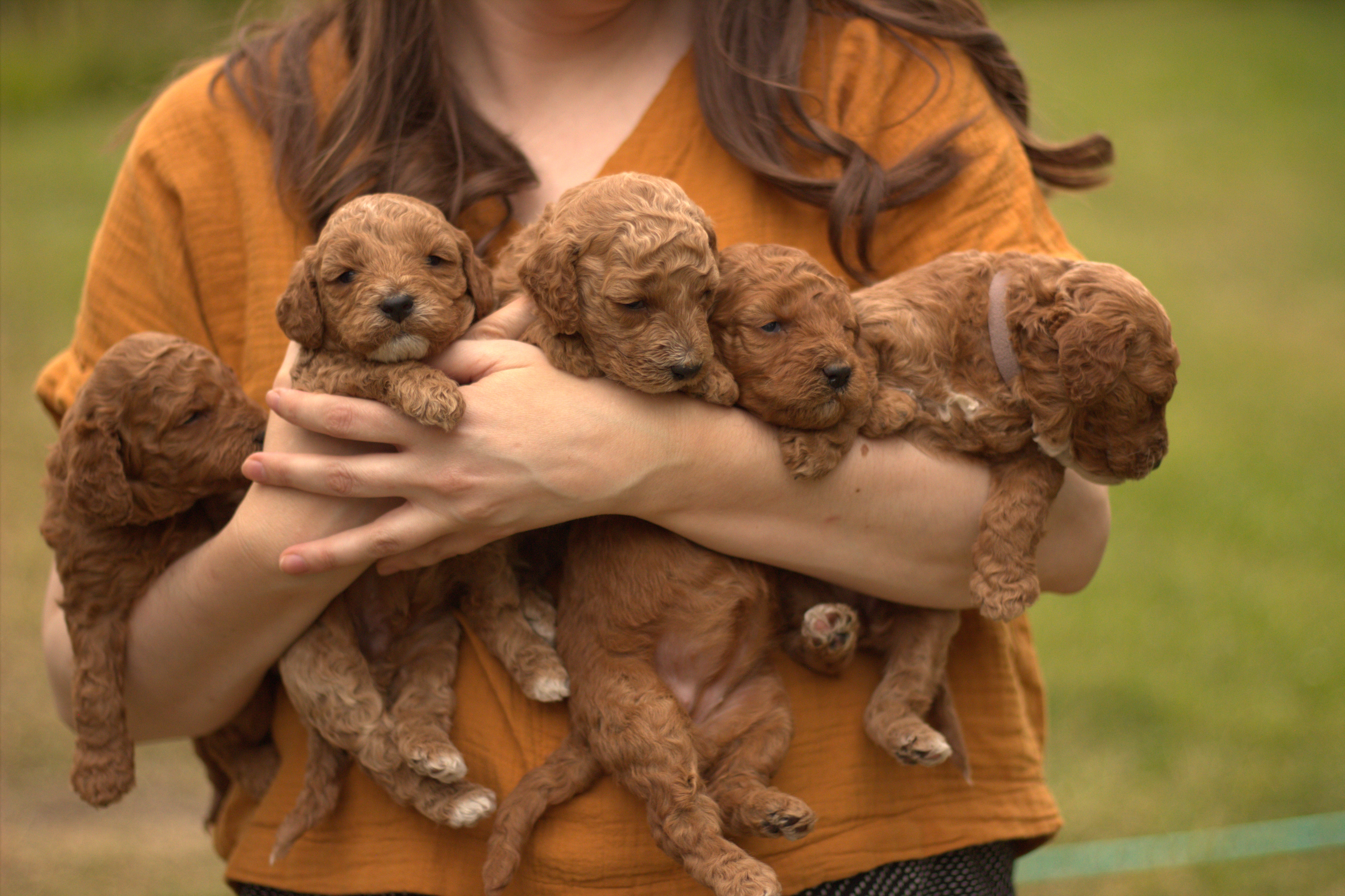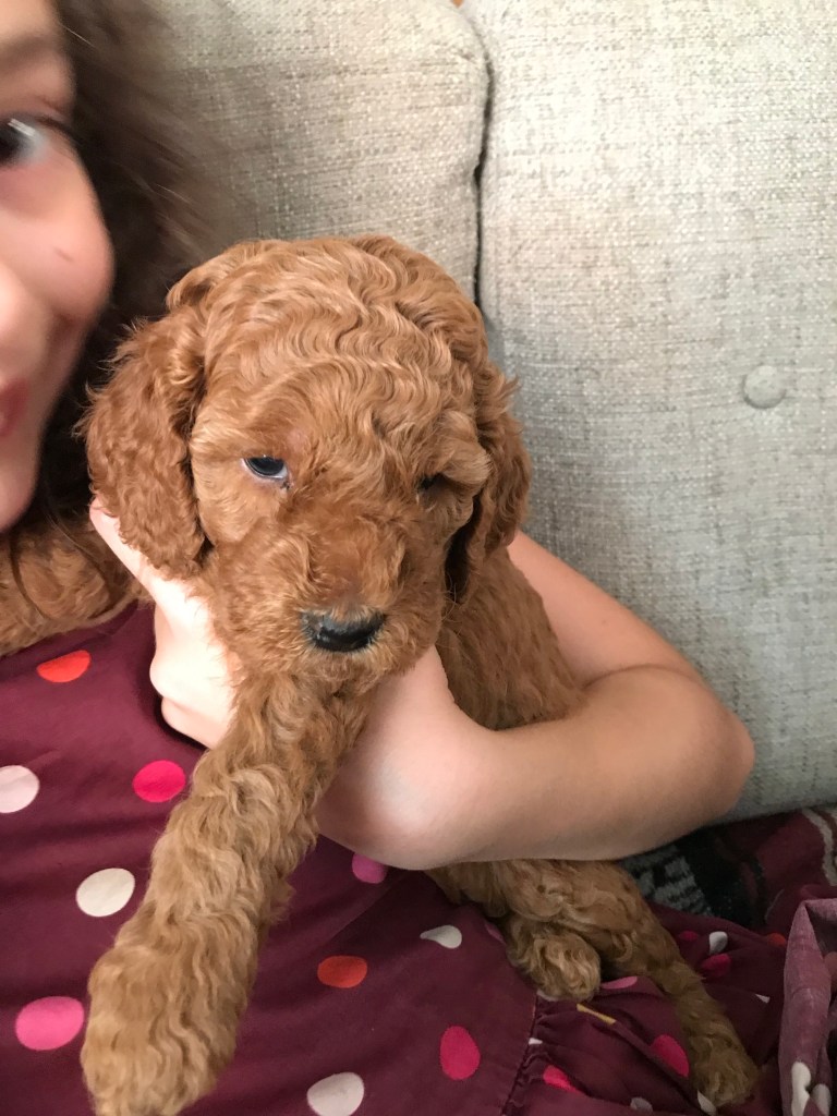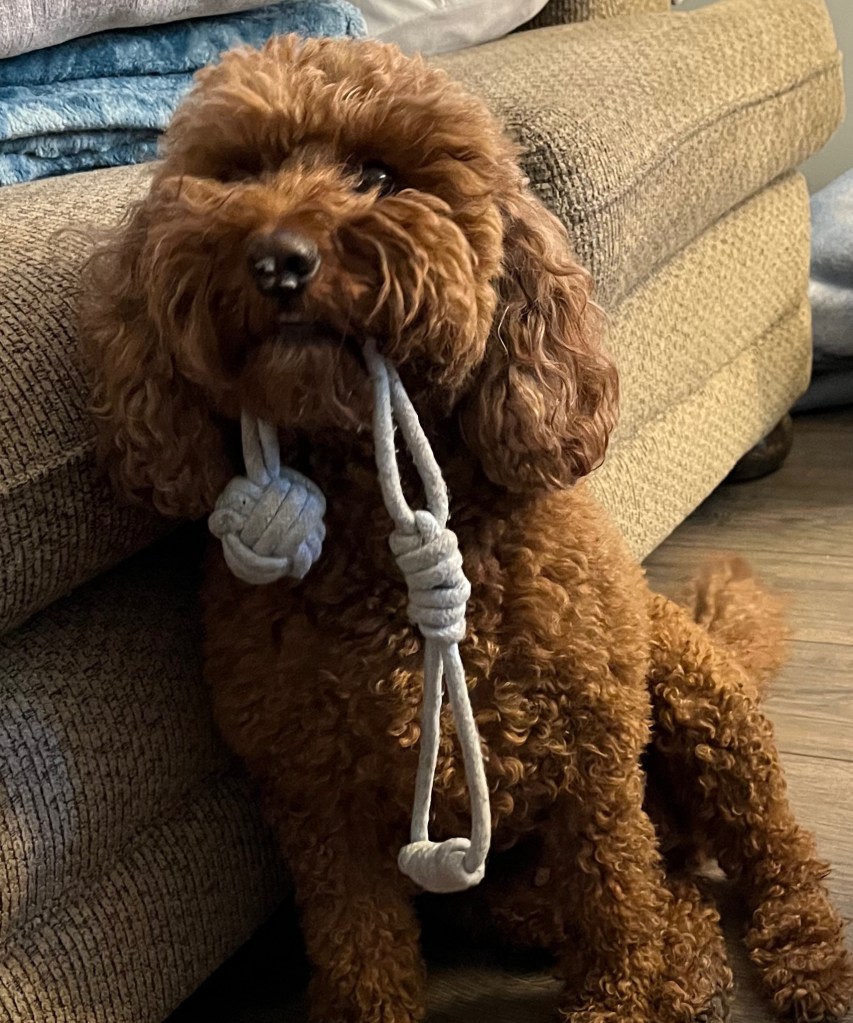“Reddi Rocket”, AKC Red Miniature Poodle, Sire Rocket is a loving gentleman, a great dog, fully health tested and OFA certified. “Maggie”, Miss Personality Plus, Maggie is our daughter’s glam girl, her travel companion, a great party tricksterand water-loving retriever. Maggie has tested clear on her genetic health panel.